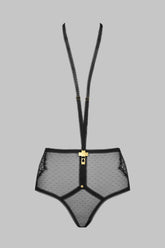 High-waisted briefs teaming Gothic lace with Swiss dot stretch mesh. A rear slit shows off the small of your back. Elasticated picot trim seams and scalloped lace to accentuate the buttocks. Embellished with a removable adjustable harness that attaches with a gold cross to different buttons.
