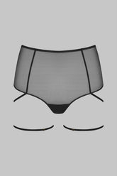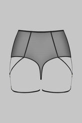 The L’AMOUREUSE high-waist tanga, in tulle of absolute transparency, is highlighted by transverse trompe-l’œil seams extended into adjustable, non-removable thigh garters that frame the silhouette.