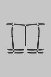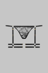 The Mini Thong with Garters JEUX MAGNÉTIQUES turns lingerie into a playground. Crafted in stretch floral lace, it comes with removable, fully adjustable garters fastened by golden magnetic buttons. The fit adapts with two golden side clasps, while a magnetic button at the back allows the thong to open completely. A playful and versatile piece, designed to follow the rhythm of desire.