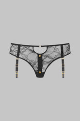 The Suspender Panty JEUX MAGNÉTIQUES reveals a play of lines and textures designed to seduce. Crafted in stretch floral lace, it sits low on the hips and opens at the front with a discreet golden magnetic button. Two teardrop cut-outs, placed at the front and at the small of the back, highlight the silhouette with boldness. The removable and adjustable suspenders are adorned with golden metallic finishes for a look that is both elegant and magnetic. To coordinate as desired with the stockings from the collection.