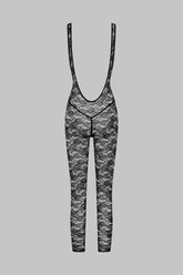This open-backed catsuit features mostly recycled openwork lace. Fitted style with flat elasticated trim. Its plunging neckline, accentuated armholes and bold backless style take us back to the '80s.