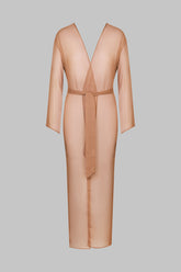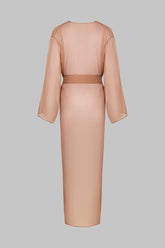 Light as a caress, the Sienne Fever kimono wraps the body in a sheer, airy veil with subtle transparency. Its long, straight cut flows into wide sleeves, creating a fluid and ethereal silhouette. A removable belt, threaded through two side loops, allows for versatile styling—whether worn loose or cinched at the waist.