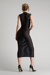 Microfibre midi dress with openwork, transparency and graphic stripes. Collar and armholes bordered with plain black microfibre for a contrasting effect. Very fitted cut that shows off the silhouette.