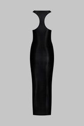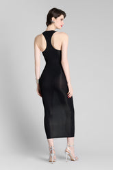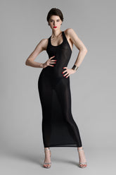 Long dress with a unique feel. Stretchy, ultra-soft, lightweight ribbed modal that stretches and has a sheer, shiny sheen. Figure-hugging, streamlined design with a scoop neckline and racer back.