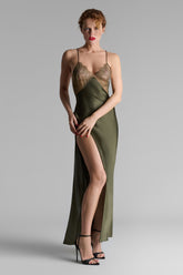 Long dress in silk and eyelash lace. Long flowing ultra-feminine silk garment with slit. V neckline and bare back adorned with rigid lace that delicately hugs the figure. Fine silk adjustable straps with golden accessories cross the back.
