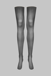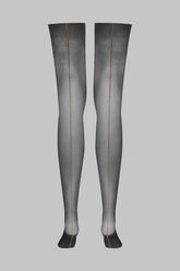 Maison Close's signature suspender stockings. Black with delicate gold LUREX® stitching that elegantly accentuates the back of the legs for a graphic, playful style. Fine, silky 20 denier voile for combining with a suspender belt for a perfect fit.