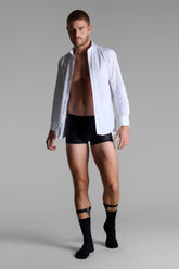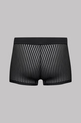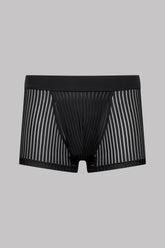 Microfibre boxer with openwork, transparency and graphic stripes. Fitted cut on the buttocks and crotch gives good support. Cut slightly shorter on the thigh than classic boxers for optimal comfort. Plain black microfibre-covered elasticated waistband. Front opening with inner lining for added comfort.