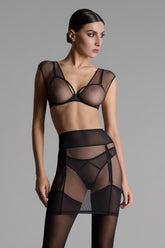 This Maison Close collection draws on the charm of a refined vintage chic that captures the eye without ever offending it. Fully sheer pieces with sharp lines and a softly powdered black dahlia shade.