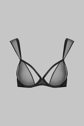 The L’AMOUREUSE openable scarf bra, in tulle of absolute transparency, features underwires for support. Wide tulle scarves can be tied as desired: around the neck to create a bust drape, or at the back for a bare-bust effect. The scarf can be slipped through the rings at the front and the additional adjusters at the back straps to style the nudity. Fine adjustable straps and a smooth, delicate back hook closure complete the piece.