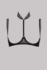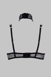 Cupless bra with underwiring fully covered with floral lace. Fully adjustable and removable neck harness with golden accessories, neck and back fastenings.