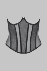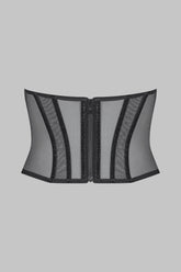 The topless corset draws on the charm of French chic that catches the eye but is never indecent. A piece that plays with transparency, featuring bold lines of silvery velvet with a radiant sheen. Structured by supple vertical whalebones at the front and back, graphic detailing in transparent tulle emphasises the waist. It fastens with a zip at the back.