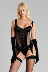 ROCOCO open garter corset in velvet and tulle, inspired by classic corsetry, designed to sculpt the waist while leaving the bust exposed. Flexible steel boning shapes the silhouette for a cinched, contoured effect. At the front, a metal busk with golden hooks closes the corset in true traditional style.