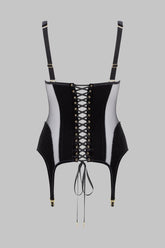 The corset extends into integrated garter straps, which are non-removable and non-adjustable. Gold jewelry-inspired clips engraved with ROCOCO complete the piece as a bold statement of seduction.