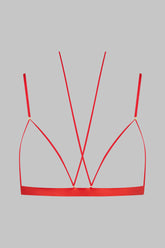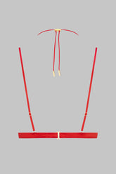 Open triangle bra, combining satin softness and boldness. Designed to reveal breasts in style. The neck lacing, repositionable and adjustable thanks to a unique adjuster and golden lipstick accessories by Maison Close, sublimates your cleavage while allowing customization according to your desires. The thin, flat, adjustable straps ensure a perfect fit. An elastic band around the bust structures the chest. Adjustable hook closure at the back.