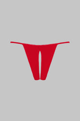 Opaque microfibre openable thong with elasticated picot trim. Openable structured design with two crossover pieces from front to back.