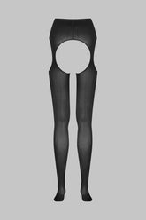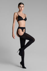 70D open tights with garter belt effect, crafted from soft, matte opaque veil for uniform leg coverage. The open garter-inspired design reveals the hips and crotch, tracing a bold graphic line along the upper thighs while maintaining full opacity on the legs.