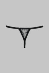 Openable thong adorned with a gold cross to team Gothic lace with Swiss dot stretch mesh. A mini lace triangle on the back accentuates the crease of the buttocks. Elasticated picot trim and openable wrapover panels made of Swiss dot mesh in front.
