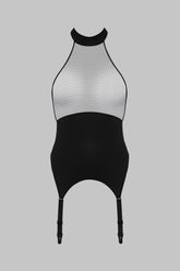 The halter-neck garter bodysuit Pure Tentation outlines the body with precision. The high neck, closed with a discreet hook, frames the silhouette and reveals a fully sheer bust, playing on the power of suggestion.