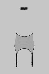 At the back, the ultra-sheer fabric unveils the body in all its lightness, contrasting with the structuring lines of the microfiber. The non-removable, adjustable garters extend the body’s line with elegance, to be worn with or without stockings.