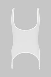 The rounded neckline and racerback trace a unique line, while the bust remains fully visible in a bold play of transparency. Adjustable, non-removable garters add structure to the look, to be worn with or without stockings depending on mood or moment.