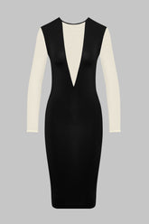 The midi V-neck long-sleeve dress – Pure Tentation embodies bold, quiet elegance. Its two-material design, blending sheer tulle and opaque microfiber, outlines the silhouette with precision while letting light pass through.