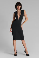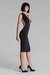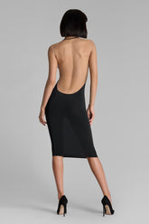 The deep V-neck subtly elongates the torso, while the ultra-sheer back creates a second-skin effect in contrast with the opaque front. The midi length gently grazes the legs for a refined, dressed yet intensely sensual look.