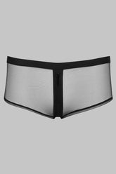 The openable shorty – Pure Tentation presents itself as a bold yet controlled statement. Its low-rise cut gently highlights the hips, while ultra-sheer tulle blurs the line between fabric and skin. A zip opening at the crotch adds an unexpected touch—both functional and highly suggestive. Without cotton lining, the piece maintains its fluidity and second-skin effect.