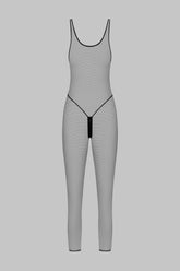 Its fitted cut follows the shape without constriction. The rounded neckline reveals just enough, while the open back accentuates the silhouette’s flow. A zip at the crotch allows for practical opening without disrupting the piece’s minimalist look.