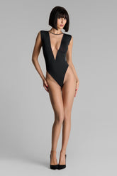 The V-neck long-sleeve catsuit – Pure Tentation wraps the body in a soft glow. Made from sheer tulle and opaque microfiber, it creates a graphic and sensual thong-body illusion effect.