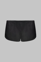 Low-rise shorts in natural silk. Sculpted by rounded vents on each side to enhance the figure. Thin straight elastic waistband covered by gathered silk.