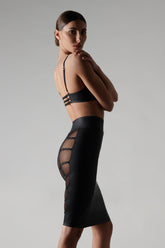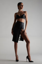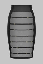 Matte leather effect and sheer tulle skirt. Wide fitted belt to show off the figure and waist. Transparent tulle harnessed with adjustable elasticated straps on the back. Opens at the front with two tone-on-tone zips. The collection's signature golden "feti-chic" ring embellishes the front, inviting you to attach it.