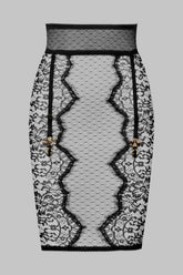 Suspender skirt combining rigid eyelash lace and stretch Swiss dot mesh which sculpts the silhouette. Elasticated picot trim belt sculpts the waist. Four detachable, adjustable suspender straps embellished with golden crosses. Non-opening golden buttons emphasise the curves.