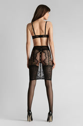 An elegant skirt that highlights the curves. To be worn day and night together with a body-thong and our cut and curled stockings.