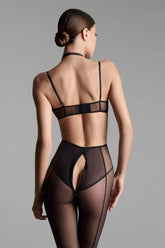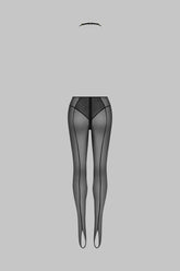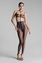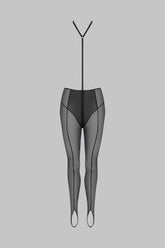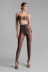 The L’AMOUREUSE stirrup leggings, in tulle of absolute transparency, are structured by seamwork that shapes the full silhouette, with a double couture-stocking effect and a stirrup finish. High waist doubled at the front and back. Removable, adjustable neck harness, two-way crotch zip.