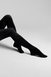 ROCOCO stockings in full velvet, designed to extend the leg line with striking intensity. The soft fabric hugs the skin, while graphic V-shaped cuts on the foot add a couture touch to the silhouette. With closed feet for a continuous velvet look, they are the perfect match for the garter belts and corsetry pieces from the ROCOCO line.