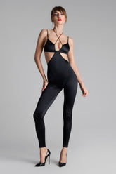 Catsuit with bralette neckline, combining satin softness and unique style. The seamless cups are elegantly structured with pleating at the neckline. Repositionable and adjustable thanks to a unique adjuster and gold lipstick accessories by Maison Close, the lacing around the neck enhances your décolleté while allowing you to personalise it as you wish. The flat and adjustable fine straps ensure a perfect fit. An elasticated band around the chest perfectly hugs and shapes the bust. Adjustable hook-and-eye fastening at the back.