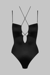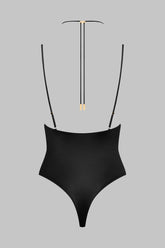 Thong body with straps, combining satin softness and elegant style. A ravishing back structured with flat and adjustable fine straps and an unmistakeable 80s-style neckline. Lacing detailing delicately pleated at the front offers adjustable, elegant openings thanks to a unique adjuster and gold lipstick accessories by Maison Close, to adjust as you wish. Adjustable hook-and-eye fastening at the crotch.