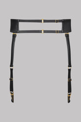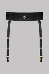 Faux leather suspender belt 4 adjustable and removable suspender straps with golden ornamental trims. Can be worn on its own as a belt. Fastens with elasticated adjustable straps at the back. The collection's signature golden "feti-chic" ring embellishes the front, inviting you to attach it.