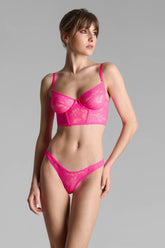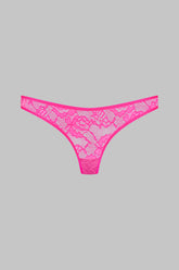 The neon tanga is adorned with mostly recycled openwork lace. Edged with a flat elastic, its low-cut shape emphasizes the hips for an assumed 80s style. An ultra-fine lingerie to match with all Flashback tops or on its own for a minimalist look.