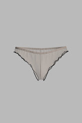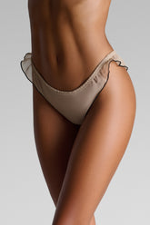 Tanga in transparent chiffon, light and airy. The elastic waistband gently follows the body’s curves. The high-cut French silhouette is finished with delicate ruffles that highlight the hips and bring a retro 80s flair.