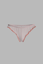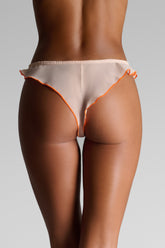 Tanga in pastel-colored chiffon, trimmed with fluorescent accents. A distinctly feminine French cut, elasticated at the waist and delicately high-cut with airy ruffles, elongates the legs and gracefully reveals the hips. No cotton lining for complete transparency.