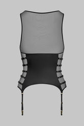 Matte leather effect and sheer tulle suspender top. A piece with graphic cut-outs harnessed with adjustable straps on the sides. Four adjustable and removable suspenders. The collection's signature golden "feti-chic" ring embellishes the front, inviting you to attach it.