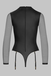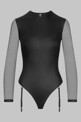 Matte leather effect and sheer tulle long sleeve G-string bodysuit Opens at the back with a tone-on-tone zip. 4 adjustable and removable suspender straps with golden ornamental trims. The collection's signature "feti-chic" ring embellishes the neck, inviting you to attach it.
