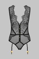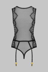 Thong bodysuit adorned with a gold cross to team Gothic lace with Swiss dot stretch mesh. Elasticated picot trim and gold button details structure the silhouette. Opens by a hook and eye fastener at the crotch. Trimmed with 4 suspender straps with adjustable, detachable extenders with gold crosses.