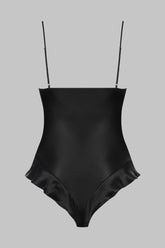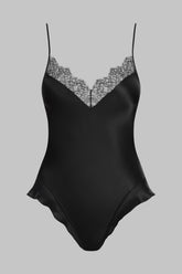 Thong body in silk and eyelash lace. Our famous ultra-feminine ""French cut"" with a hint of retro that eloquently shows-off the hips and buttocks. V neckline adorned with rigid lace delicately holds the bust. Thin adjustable silk straps with golden accessories. Non-openable crotch for extra comfort.