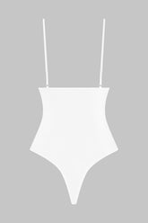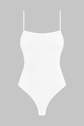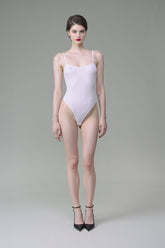 High-leg thong bodysuit with unique feel. Stretchy, ultra-soft, lightweight ribbed modal that stretches and has a sheer, shiny sheen. Snug fit with cotton lining and adjustable hook-and-eye fastenings on crotch. Non-removable, slim, adjustable straps with silver trim.
