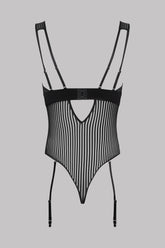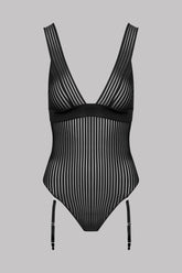 Microfibre thong bodysuit with a plunging neckline, openwork, transparency and graphic stripes.