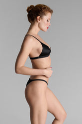 Natural silk triangle bra. Triangle cups without underwire that hold the breasts perfectly. Thin straps covered with gathered silk at the front and adjustable elastics at the back with golden accessories. Elastic band covered with gathered silk beneath the breasts. Fastens at the back with a adjustable clip.