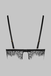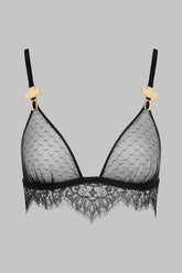 Triangle bra with stretch Swiss dot mesh on the cups. Garter belt style straps embellished with golden crosses can be adjusted and detached at the front for a topless effect. Adjustable hook-and-eye fastening on the back. Rigid eyelash lace highlights the back.