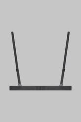 The triangle bra is adorned with transparent tulle that artfully decides what it reveals, cloaking intimacy with a veil adorned with anthracite rhinestones.